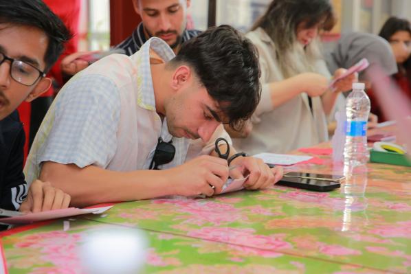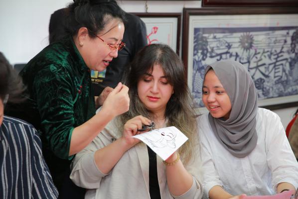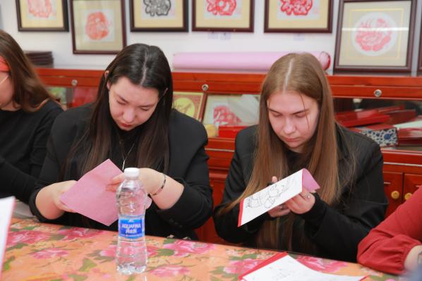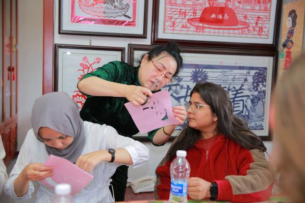在动手实践环节,传承人从握剪刀的姿势、纸张的折叠方法教起,耐心指导每位留学生完成属于自己的剪纸作品。起初,面对纤细的剪刀和柔软的红纸,不少留学生显得有些紧张。来自摩洛哥的拉赫曼看着自己歪歪扭扭的线条,有些不好意思地说:“原来剪纸看起来简单,实际操作这么难,稍微一用力,图案就断了。”传承人见状,走到她身边手把手教学:“剪直线手腕要稳,剪曲线要慢慢转动纸张,不用着急。”在老师的鼓励下,拉赫曼调整呼吸,重新拿起剪刀,一点点勾勒出“福”字的轮廓。另一边,来自伊朗的法蒂玛选择了难度稍大的“连年有余”图案,她一边对照传承人提供的模板,一边回忆讲解环节中的民俗故事,“我要把这个‘年年有余’剪好,带回去送给我的家人,让她们也知道中国的吉祥文化”。2个小时的实践中,活动室里满是剪刀裁剪纸张的“沙沙”声,偶尔传来留学生们互相交流技巧的笑声。当一张张红纸在手中变成形态各异的剪纸作品时,每个人脸上都洋溢着成就感,纷纷举起作品拍照留念。